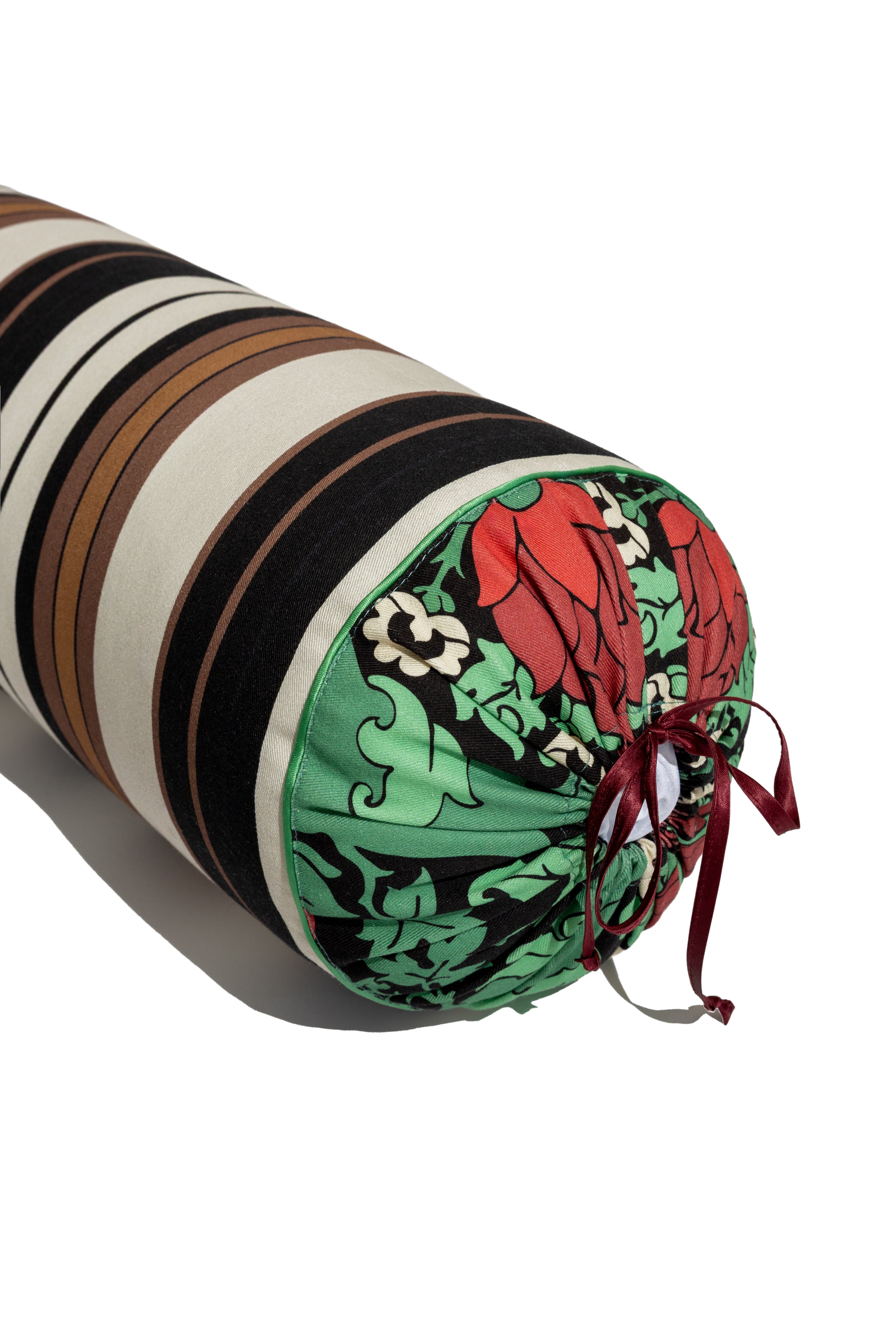 - gathered with a flourish of deep burgundy ties and finished with a bold floral print in green