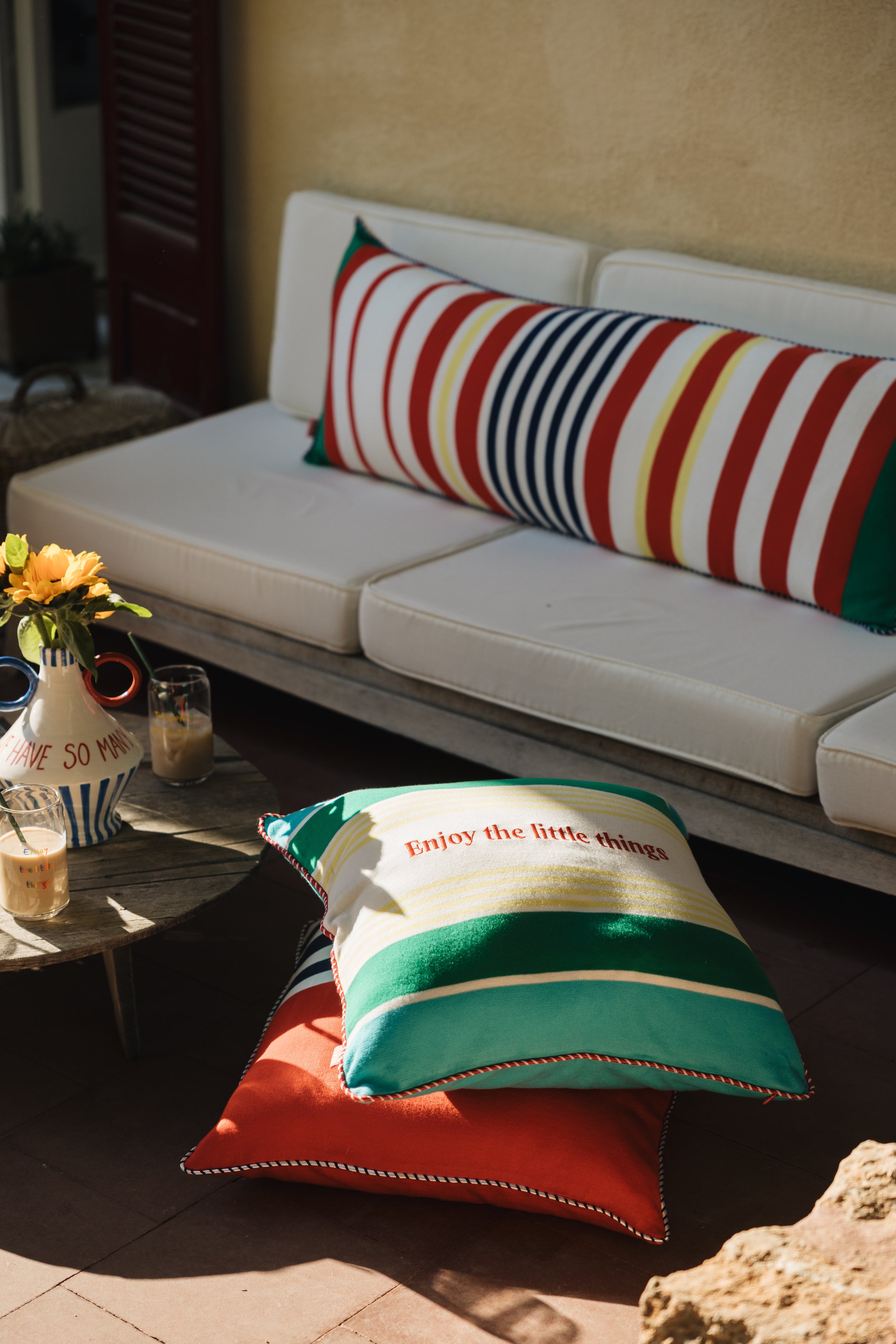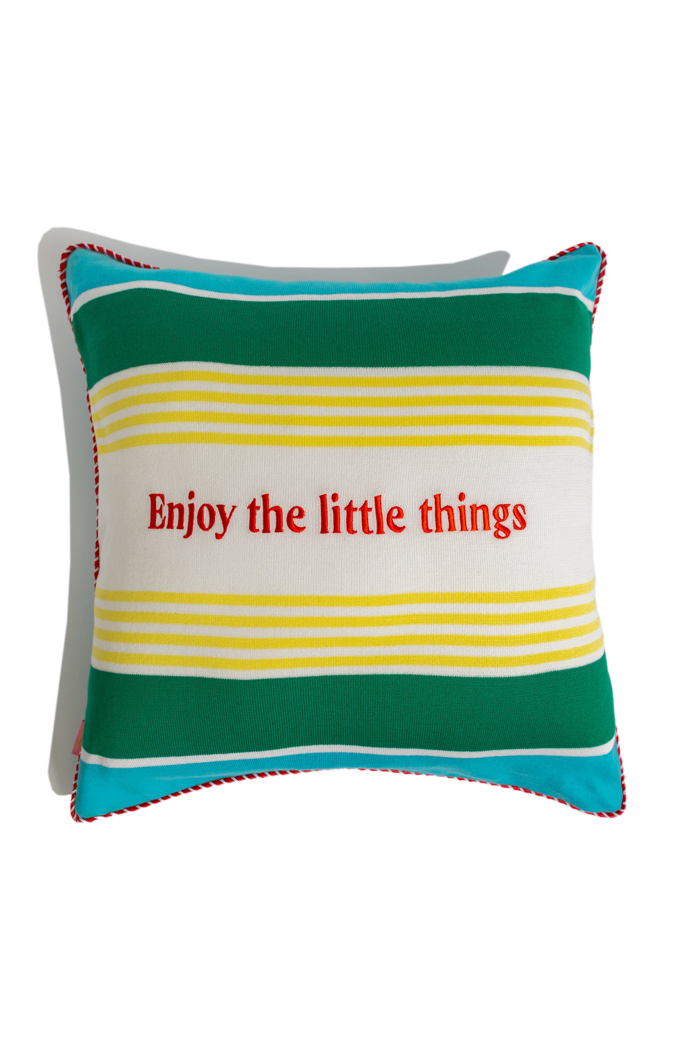 - The centered phrase—“Enjoy the little things”—is embroidered in bold red lettering, reminding us to pause and appreciate the everyday.