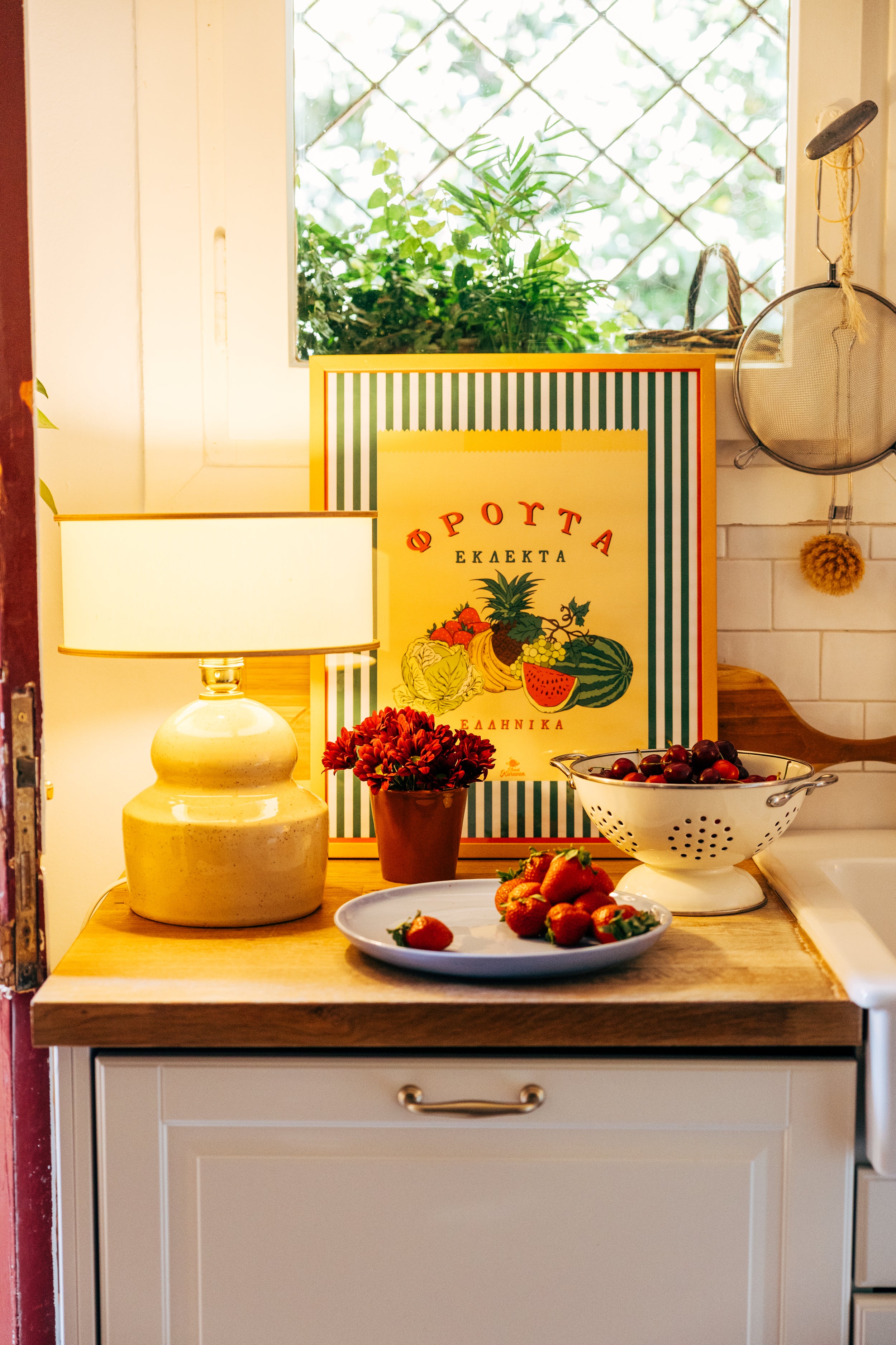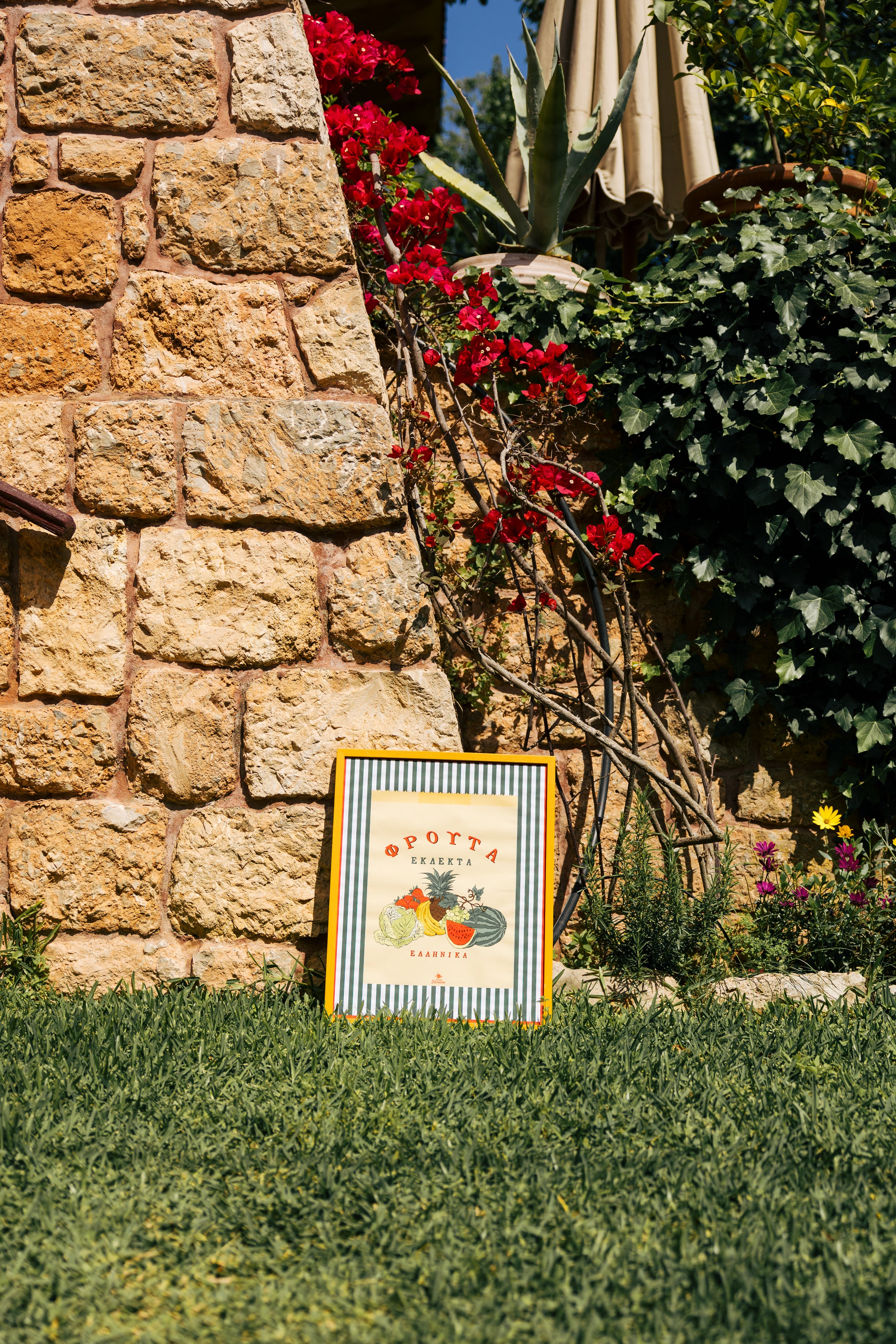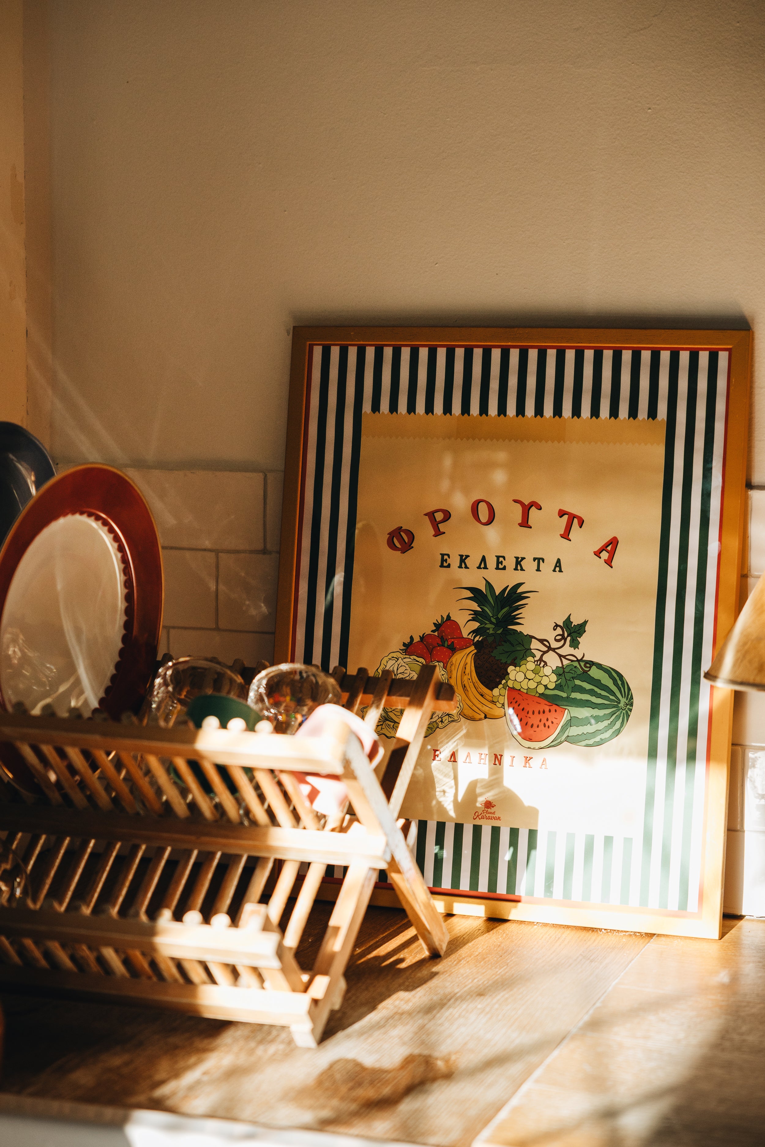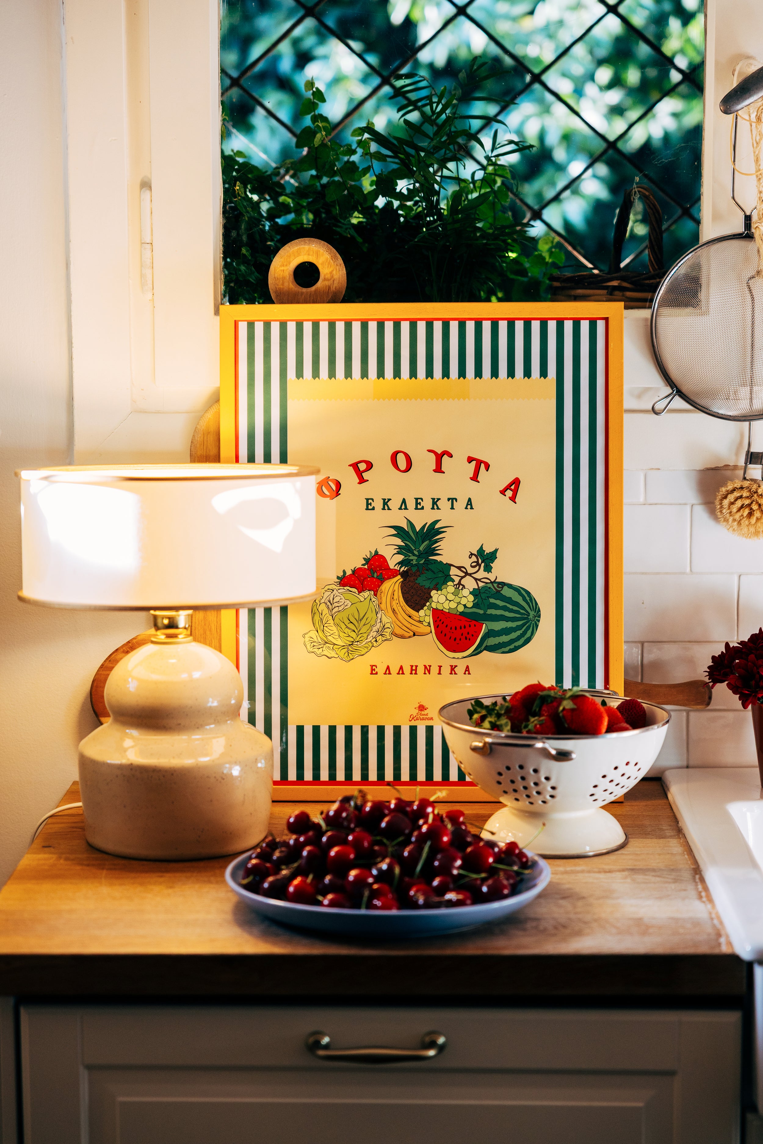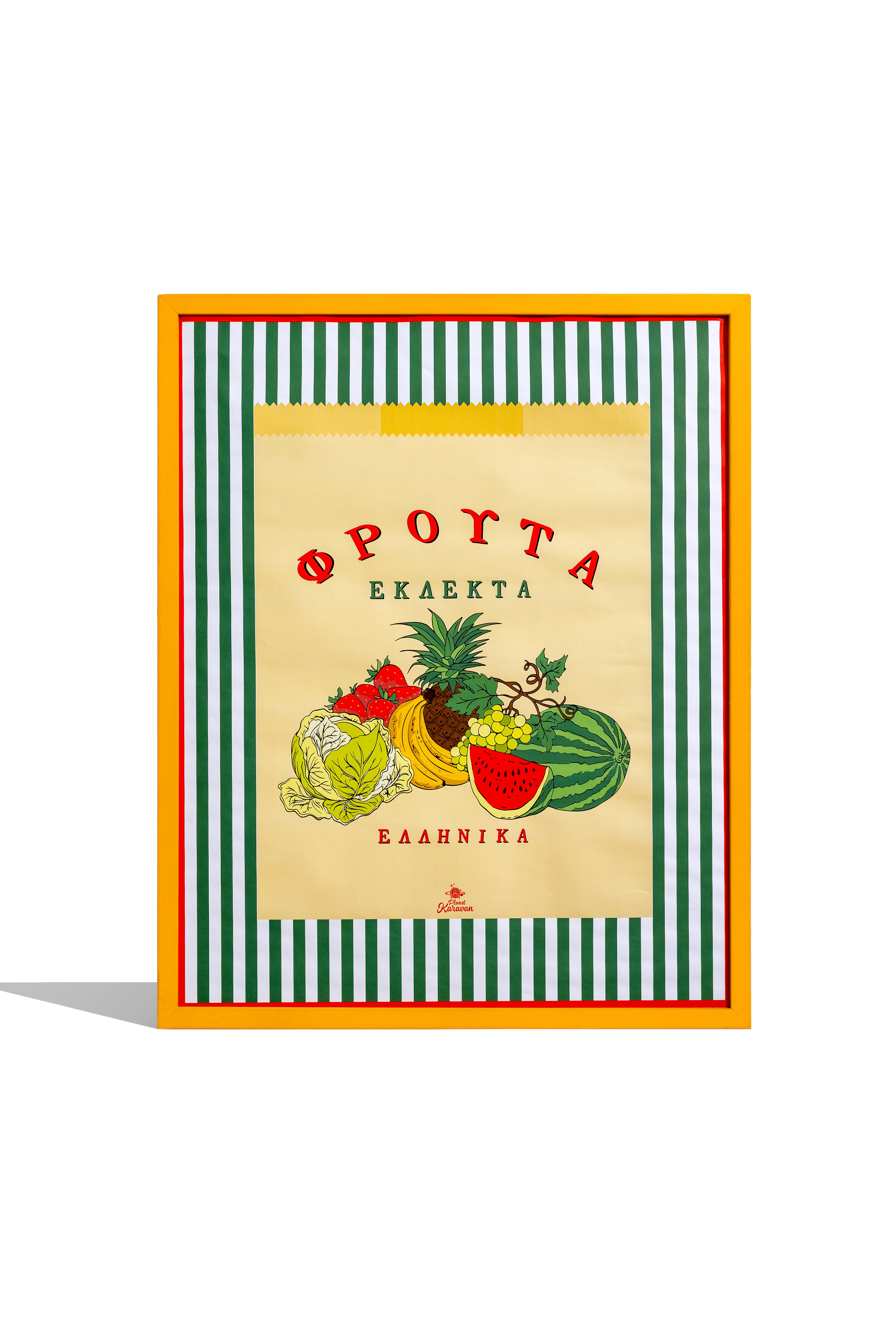 • A retro revival of the classic Greek fruit market bag with bright produce illustrations and Greek text.